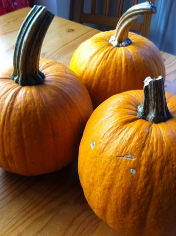 Last weekend we went to our local farm that, in addition to their own produce, also sells other mostly local produce. They had sugar pumpkins or what I call pie pumpkins! We had been looking for them in our grocery store but they hadn’t been there due to the drought so this was a great find. Today I finally had a chance to roast them and will have puree for several recipes. Then, I made pumpkin apple muffins. Tomorrow I’ll roast the seeds and freeze the puree for future recipes!