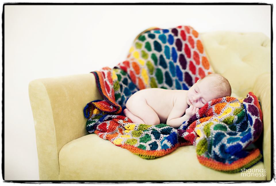 When I was pregnant with Cameron, I made him a blanket.  He has since used it at home, at school and everywhere in between.  He loves it and four years later, he still uses it.  So, I decided it was worth making one for C2 when I was pregnant with him.  My big criteria, no pieces to sew together!  At Stitches West in February, I met the designer of this blanket and saw one of the versions she did of it for her kiddo.  I fell in love and immediately began purchasing yarn to make a version of my own.  I knew I wanted it bright and with the help of my yarn purchasing gurus, Jess & Mary-Heather, I picked out the colors from Miss Babs and Alpenglow.  When choosing how to lay them out, I realized I had the whole rainbow represented, so I did the color progression in rainbow order.