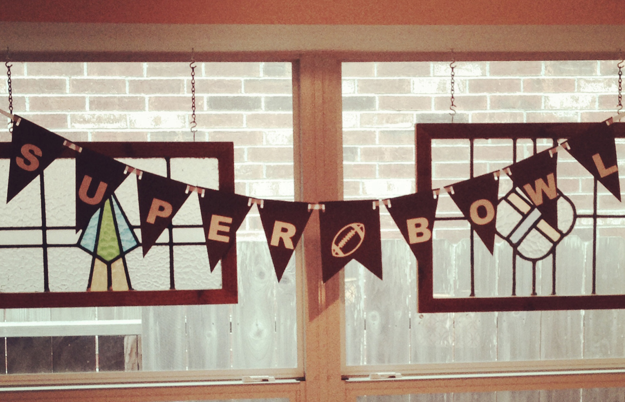 I got a Silhouette Cameo for Christmas (it’s basically a fancy die cut machine that will cut lots of materials), and have been putting it to work with all sorts of projects, but I think my favorite one is the holiday banner in our breakfast nook. It all started with making a banner for the Super Bowl. I didn’t want to worry about centering it, etc., so when I saw this banner with holes for the ribbon to go through, I decided that was the way to go.
