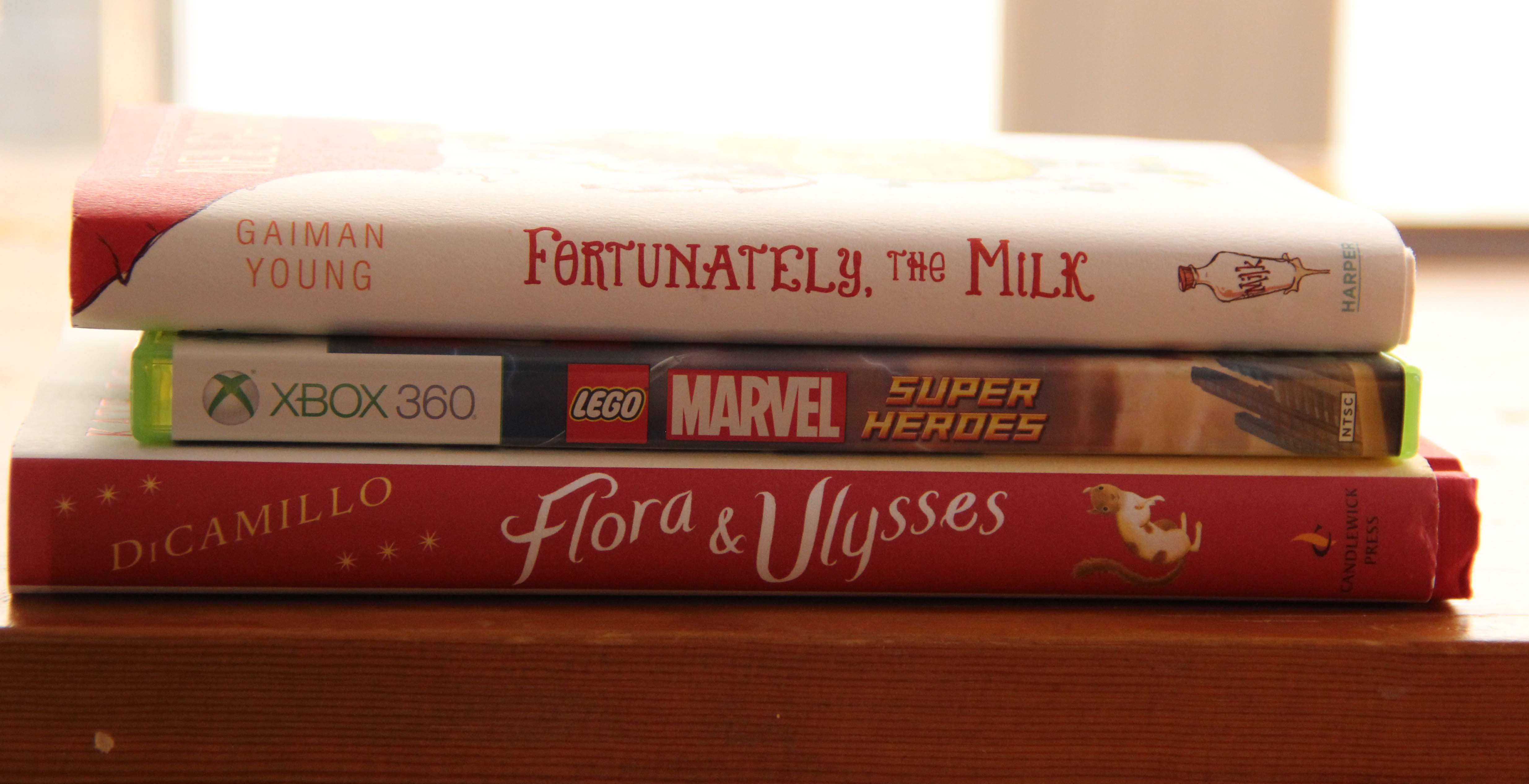 Not too long ago, we finished reading Fortunately The Milk as a read aloud book. It was a gift from Mary-Heather, and he loved it. It was just silly enough to keep him interested, and each night he was sad when we were done reading. We moved from that to Flora & Ulysses, as recommended by some Twitter friends, and he loves it, too. I mean, who wouldn’t love a book about a squirrel who may or may not be a super hero? We’re not quite halfway with this one, but so far so good. Both of these books are a bit higher than his level reading wise, but they still have illustrations. It’s hard to get him to pay attention to a book without illustrations, so well illustrated books are really helpful with this.