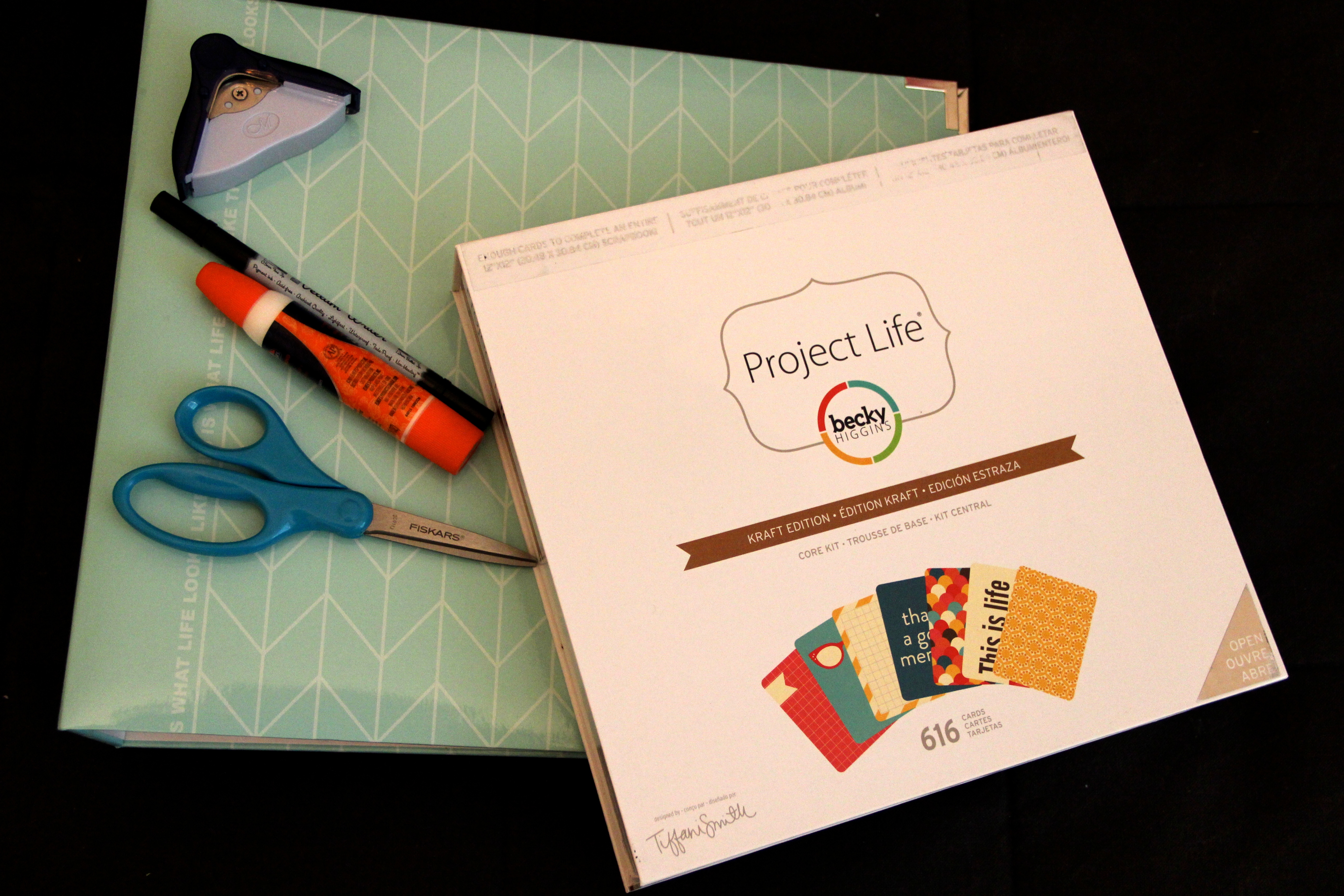 However, the more I read about Project Life, the more do-able I thought it sounded. So, I decided to give it a shot for this year. I only bought a few things, and dug some other things out of their box from my previous (brief) foray into scrapbooking. Here’s what I got to start out: