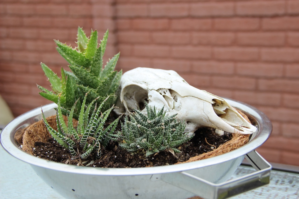 When we went to the nursery for our tomatoes and citrus trees, they had a great display of succulents. I decided to pick up a few and try to make some sort of centerpiece out of it for the deck. C1 had fun searching through the “spiky” plants and deciding which ones we should buy. Once we got home, I remembered the deer (maybe? that’s what I’m told) skull that C1 found with his grandpa while they were out exploring some time back. When he brought it home, I wouldn’t let it in the house, so it’s been hanging out on our back door landing. Since I was working on a centerpiece for the deck table, I decided it would be great to incorporate it into something useful.
