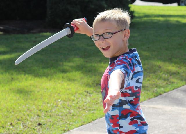 Boys sword fighting in the driveway.