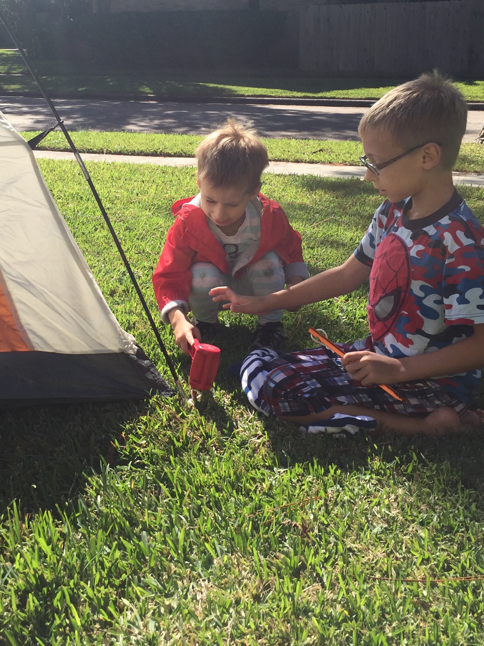 Setting up the tent in the front yard so we could clean it out after C1’s camp out this weekend.