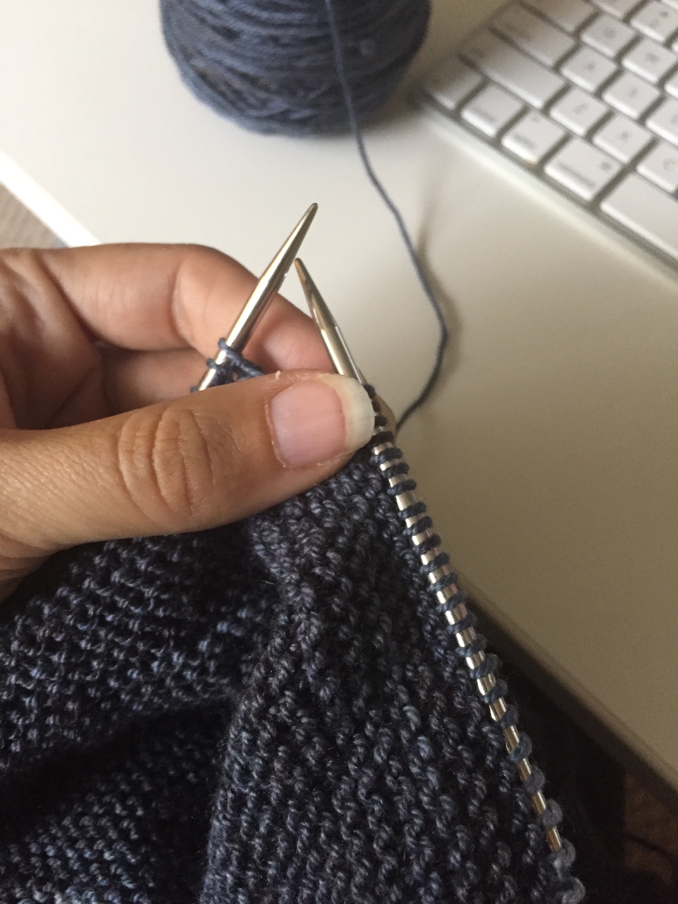 Last night, I had a finished sweater. With just ends left to weave in before blocking, I had just about reached the finish line on my Newsom cardigan. Then, this morning, while weaving in ends, I noticed a tension problem at one edge that made it look like there was a hole in the knitting. No amount of futzing with the problem made it look right. It was, of course, right on the front edge of the cardigan. I knew I wouldn’t be happy unless I frogged 2″ of garter stitch I had knit at the end of the sweater to get back past the problem spot. That 2″ took me a long time. I did all I could to avoid it, but it was inevitable, I had to frog.